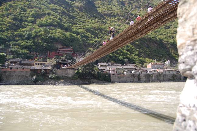 赫赫有名的红军飞夺泸定桥就在这里,桥下是水流湍急的大渡河,红军由西向东渡河。(见下图)