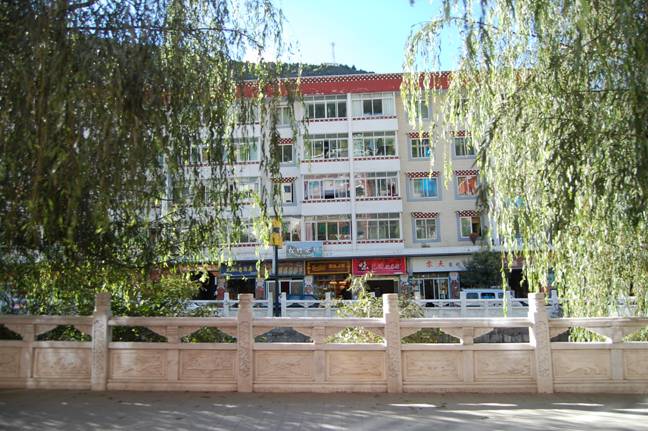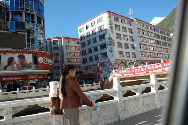 整个老镇沿河而建,318国道穿城而过。由于地形所限,拓展空间受困,所以在对面的跑马山(因康定情歌而出名)山脚下已经建了新城,远眺非常整齐和亮丽。照片显示的是老城的略影。