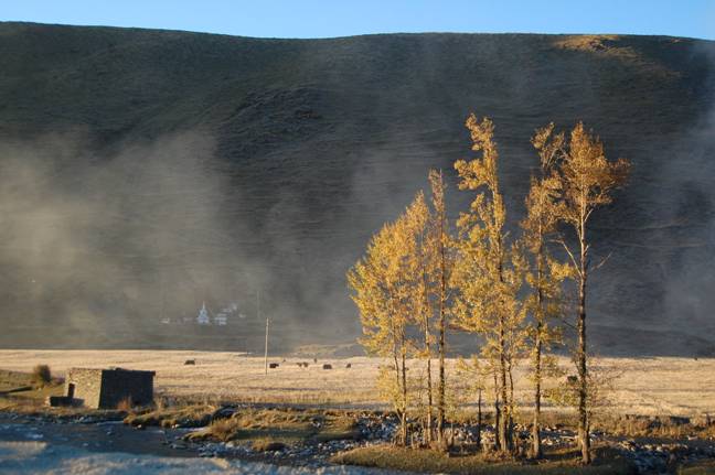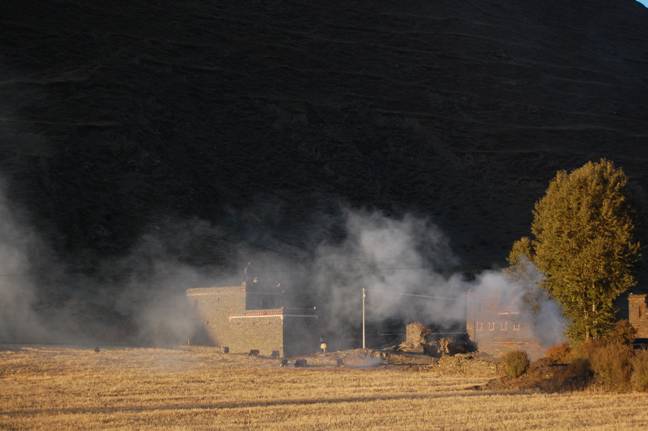 翻过山口后,逐渐进入号称“中国摄影之都”的新都桥镇地域。正值晚膳时间,远处暮色西沉、炊烟袅袅、流水潺潺,田野秋实金黄、牛羊倦归,光、影、色、人、物确实是一派极品的农牧景致!若非修路造成尘土飞扬,一定要下车驾上相机,踟蹰不肯前行了。(见下图)