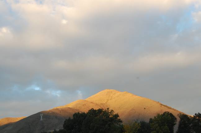 日出时分,普普通通的一座山头也觉得金字塔似的伟岸。(见下图)