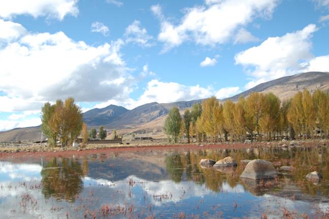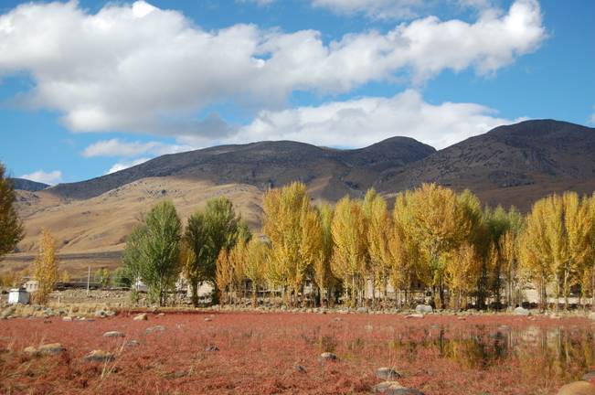 金秋十月桑堆红草滩的旖旎美景成为稻城上镜率最高的景点,每年只有1-2周时间这里的池塘满布红色水草,蓝天映衬下的风光是稻城的标志之一。(门票:RMB10.00,付了钱没给票。。。)(见下图)
