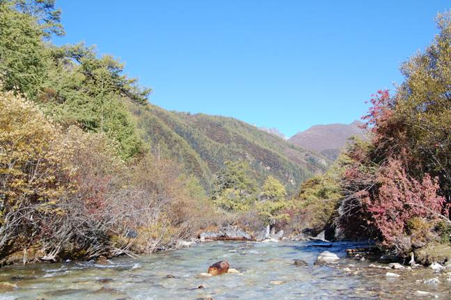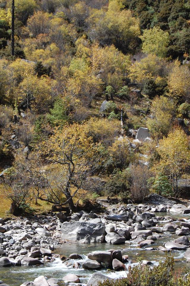 以下红黄绿间杂的落叶乔木森林,景色赏心悦目。